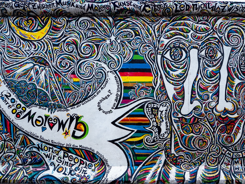 A vibrant section of the East Side Gallery in Berlin, this mural bursts with psychedelic swirls and cryptic text, capturing the spirit of artistic freedom and historical reflection. Photo by William Warby. License:CC BY. Used in accordance with license.