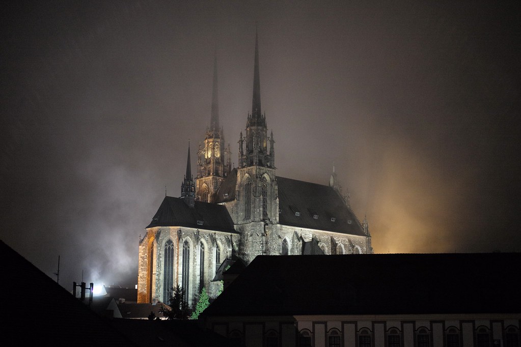 Cathedral in Brno’s Mist: A Dance of Light and Shadow