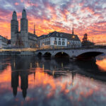 At dawn, Zurich awakens in a blaze of color — a cityscape where sky, stone, and water converge into a living canvas of serenity and artistry.