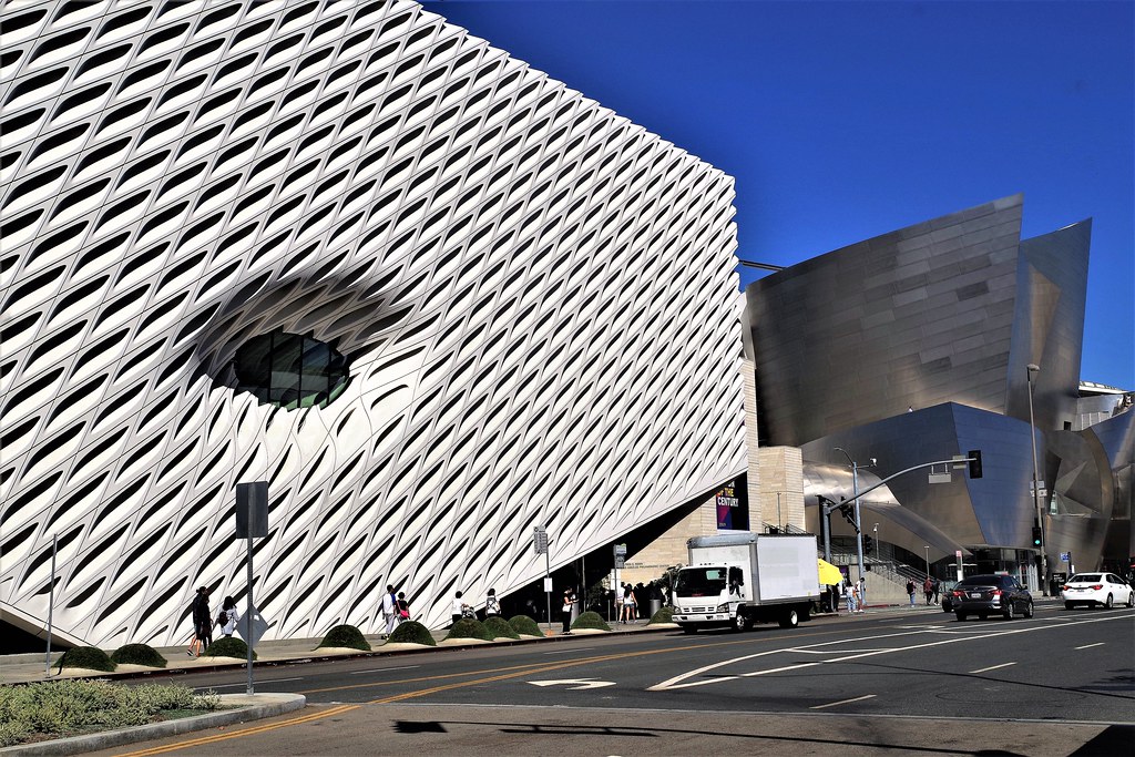 The Broad museum in Los Angeles showcases its distinctive honeycomb-like exterior design alongside the metallic curves of the Walt Disney Concert Hall. Photo by joey zanotti. Licensed under CC BY.