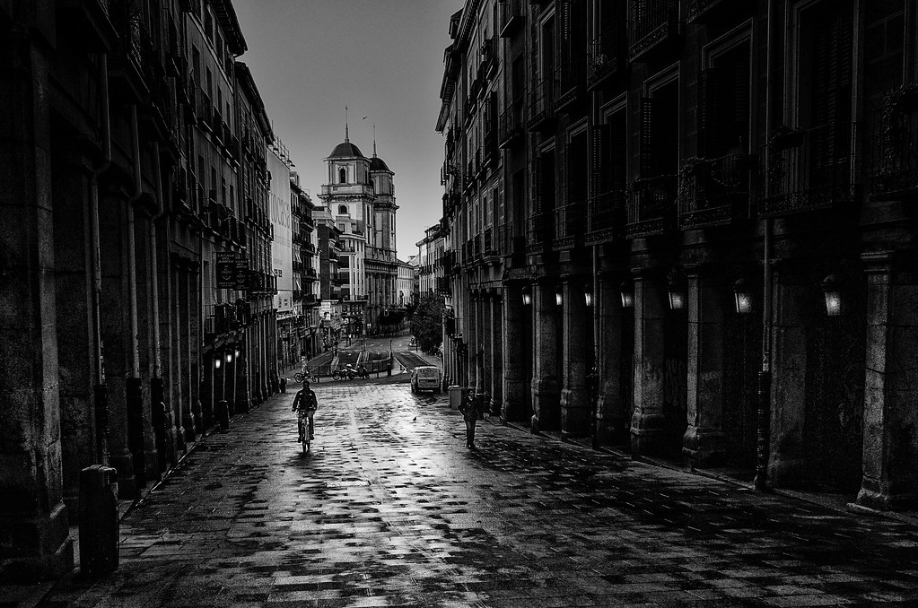 As dawn kisses the cobblestones of Madrid, a solitary cyclist threads through the quiet shadows, embraced by the city’s ancient whispers. Photo by Felipe Gabaldón. Licensed under CC BY.