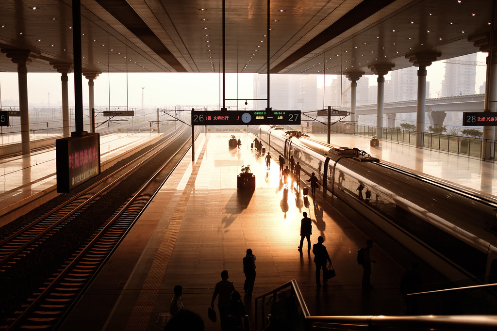 Golden light spills over Nanjing South Railway Station, where travelers’ silhouettes dance with the dawn as a train awaits its next journey. Photo by Kristoffer Trolle. Licensed under CC BY.