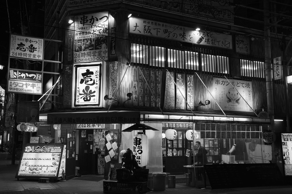 A monochrome glimpse into the colorful Shinsekai, Osaka, where illuminated signs and bustling eateries paint a scene reminiscent of vintage noir. Link to original. Licensed under CC BY.