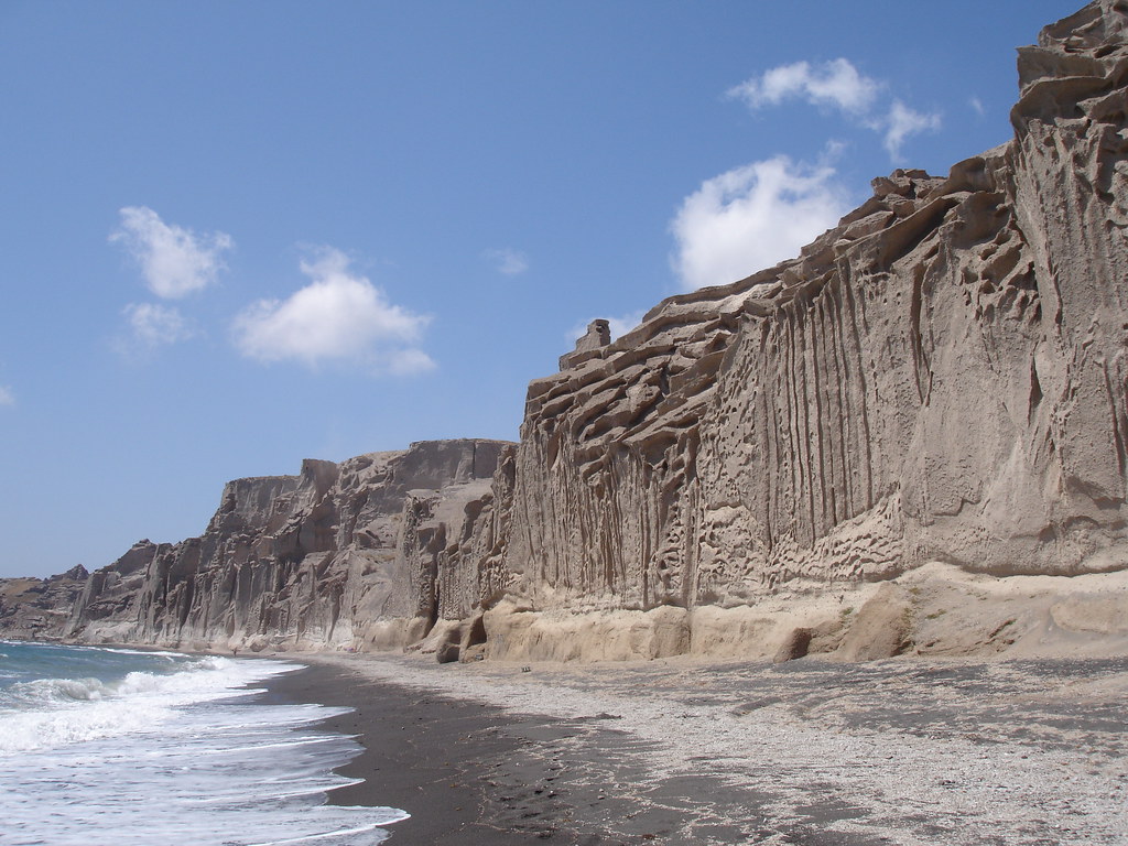 Towering cliffs with intricate textures rise dramatically above the black sands of Playa de Vlychada, creating a striking contrast against the vivid blue sky. Photo by Daniel Duce. License:CC BY. Used in accordance with license.