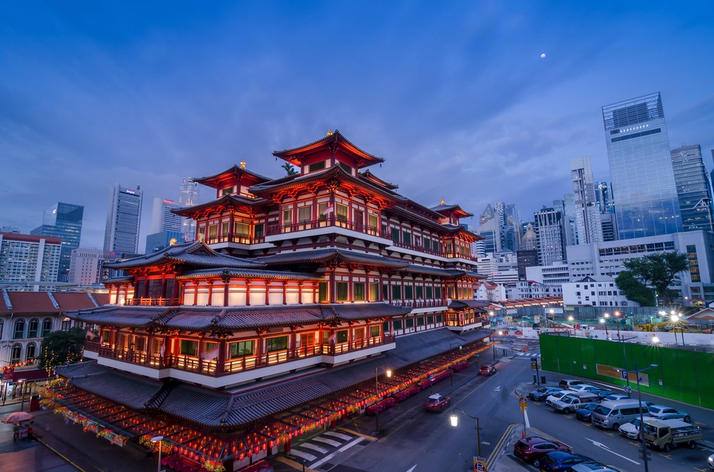 The Buddha Tooth Relic Temple stands illuminated against the evening sky, blending traditional architecture with the modern skyline of Singapore. Photo by Mantas Volungevicius. Licensed under CC BY.