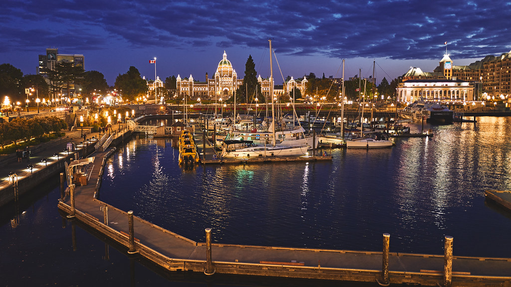 Victoria’s Inner Harbor glows at blue hour, its marina alive with reflections and the Parliament Buildings illuminated in golden light. Photo by joanne clifford. Licensed under CC BY-ND.