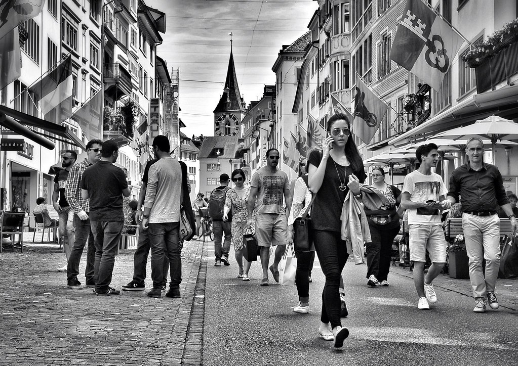 A bustling scene on Rennweg in Zürich captures people walking and interacting, set against a backdrop of charming architecture and flags fluttering in the breeze. Link to original. Licensed under CC BY.